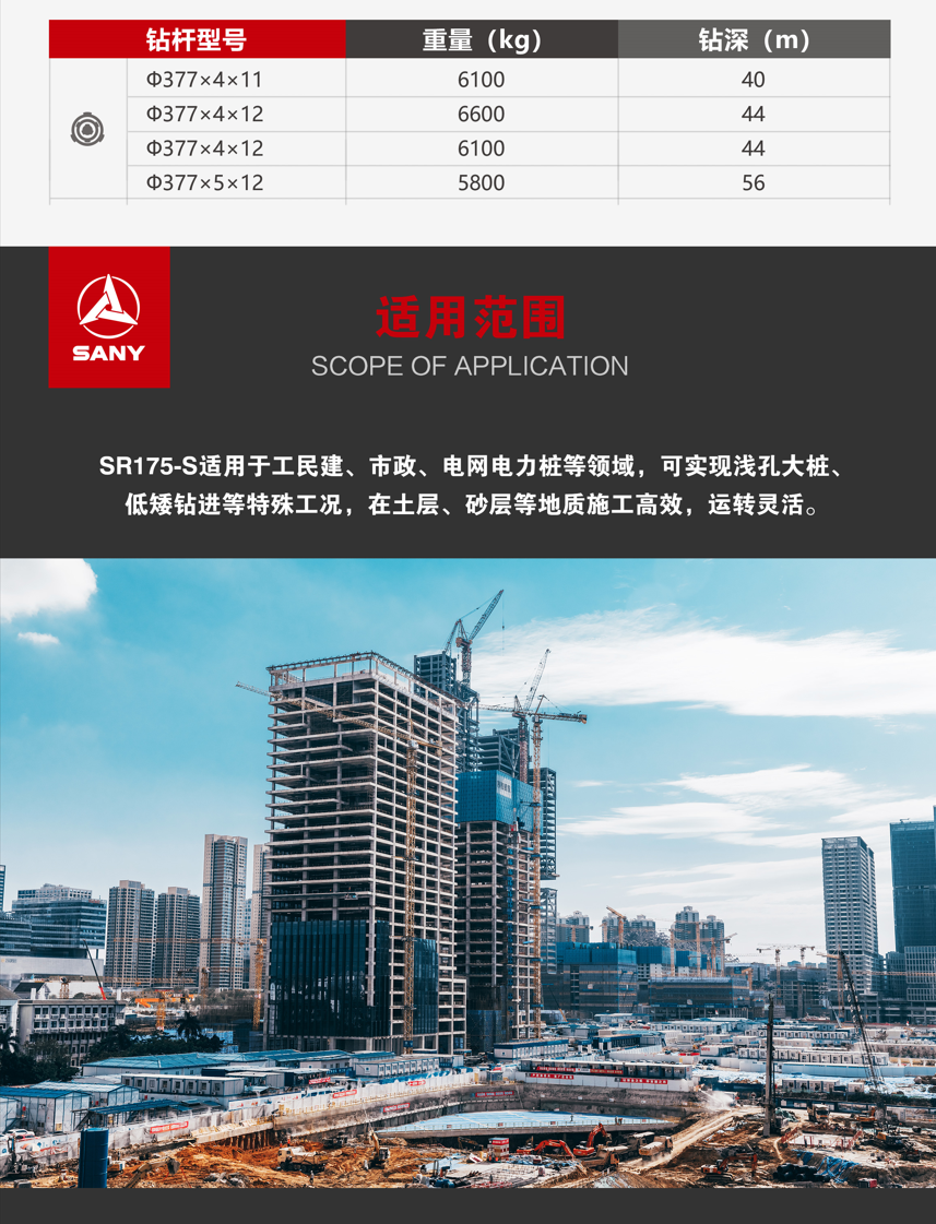 SR175-S适用(yong)于(yu)工(gong)民(mín)建(jian)、市(shi)政、電(dian)网電(dian)力(li)桩等(deng)領(ling)域(yu),可(kě)实現(xian)浅孔大(da)桩、低矮钻進(jin)等(deng)特殊工(gong)况,在(zai)土层、砂(sha)层等(deng)地質(zhi) 施工(gong)高(gao)效,运转靈(ling)活。